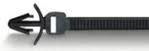 Push Mount Nylon 6/6 Cable Ties Length: 4.33" Width: .10" Tensile Strength: 18lbs Bundle Diameter: 1.1" Hole Diameter: .157" Panel Thickness: .079" • Push-mount cable ties snap quickly into a 1/4-in hole to attach a bundle to another surface • The mount portion is easily passed into a pre-drilled hole and locks into place • With Wings • Temperature Rating: -40°F to 185°F • Flammability Rating: UL 94 V-2 • Versatile cable ties can be used in countless applications • One-piece construction for consistent performance and reliability • Lowest threading force of any one-piece cable tie in the industry • Curved tip is easy to pick up from flat surfaces and allows faster initial threading to speed installation UV Black Cable Ties • Greater resistance to damage caused by ultraviolet light – indoor or outdoor use • UV Black Nylon 6/6 is used in continuous or extended exposure to outdoor sunlight. • The nylon cable tie is a weather resistant grade, enduring additional ultraviolet (UV) light. • This grade is produced by incorporating stabilizers in the nylon resin. UV Stabilized Nylon cable ties are available only in black.